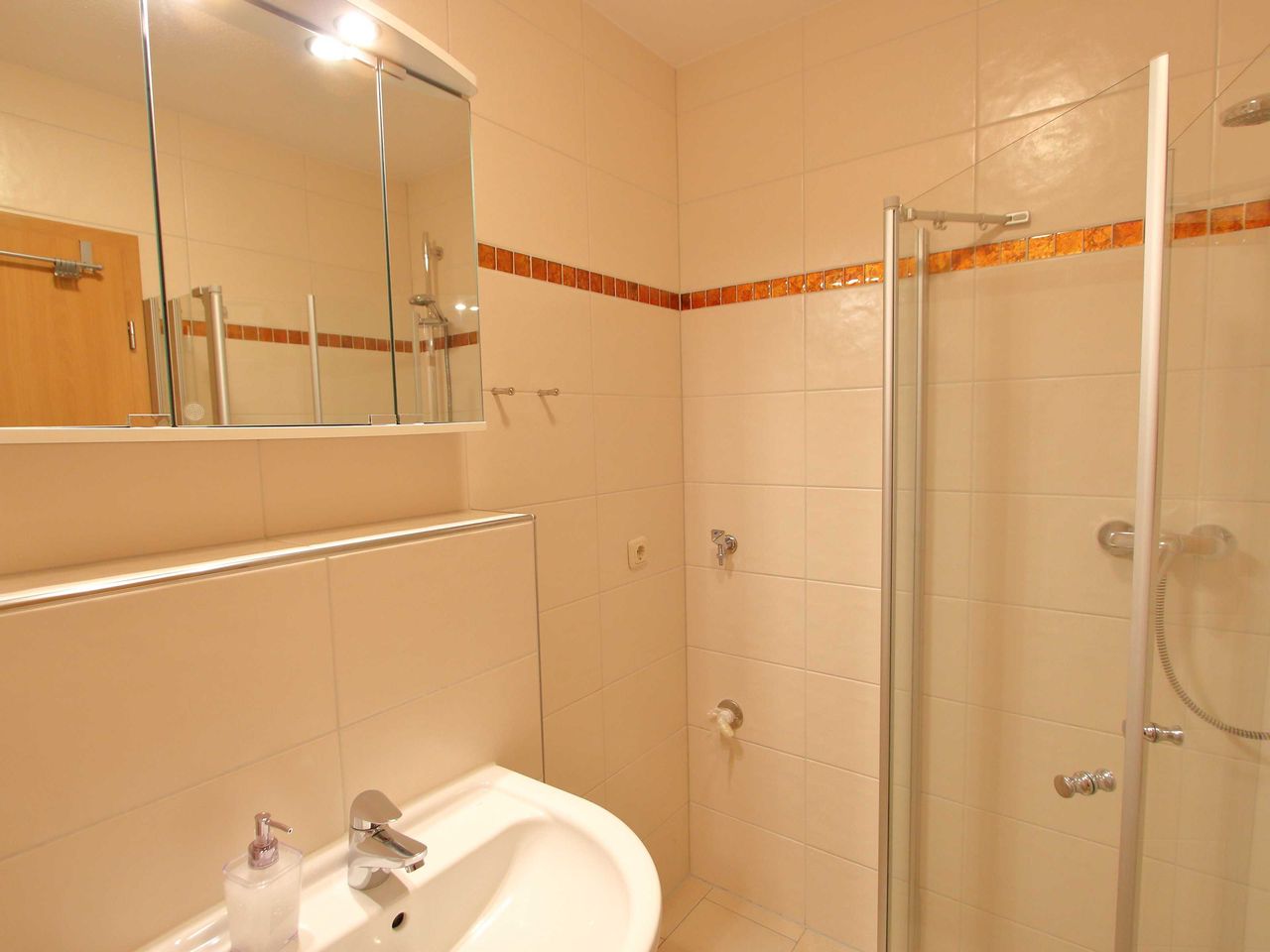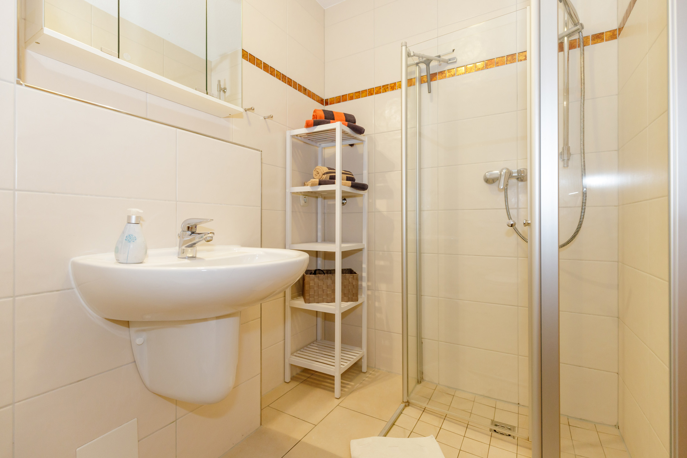 Die komplette Wohnung ist mit Fliesen ausgestattet, das Bad mit Dusche hat eine Fußbodenheizung.